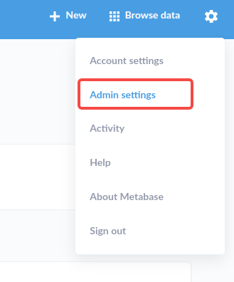 1. Click on the gear icon in the top-right corner and select Admin Settings to visit the Metabase admin page.